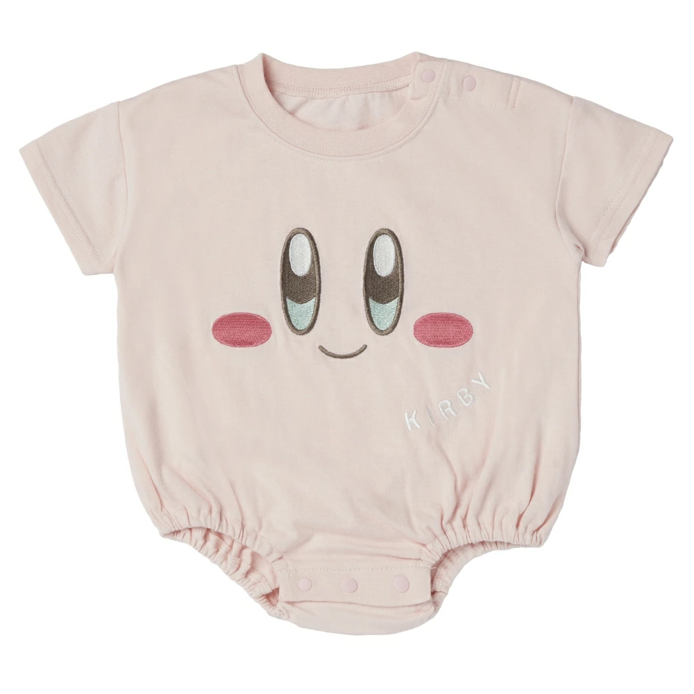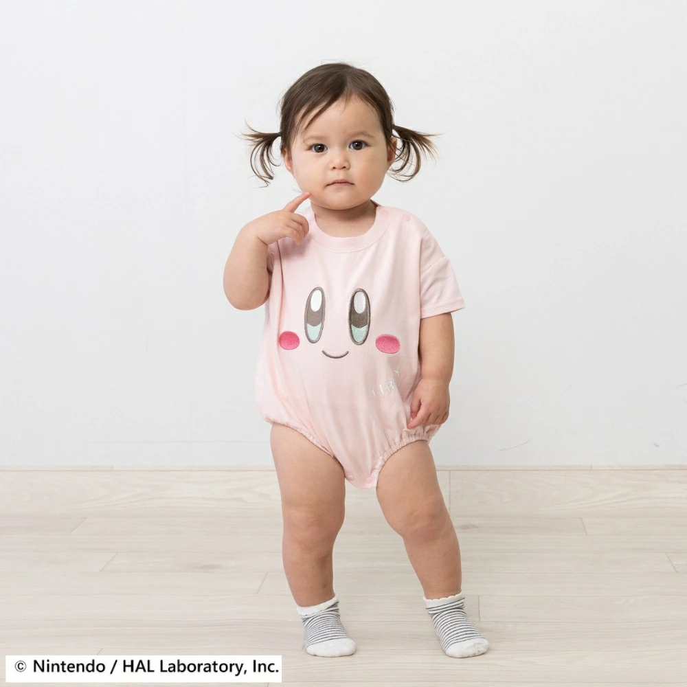 カービィの大きなフェイスプリントが目を引くインパクト抜群デザインのボディースーツ。1枚で主役級のかわいさです。