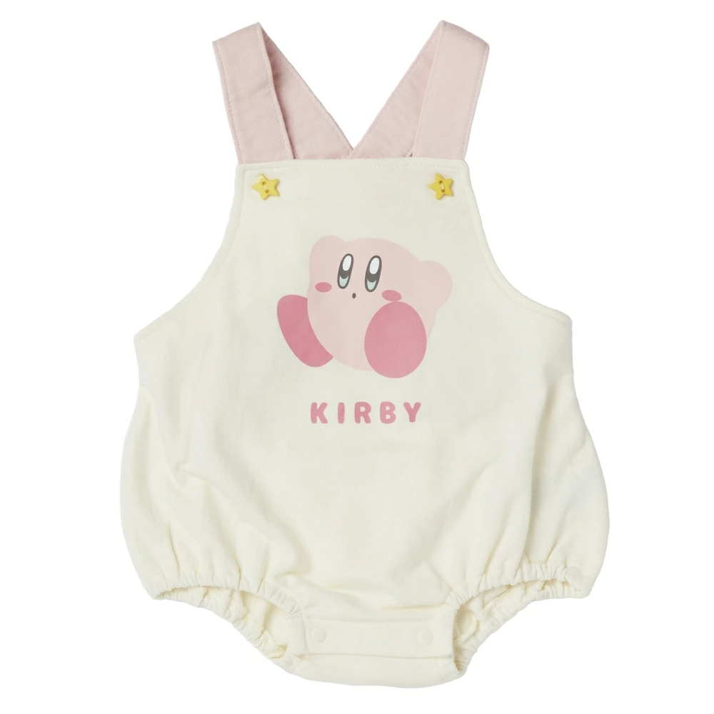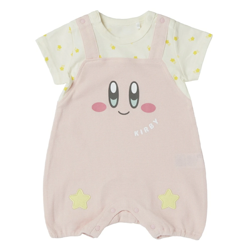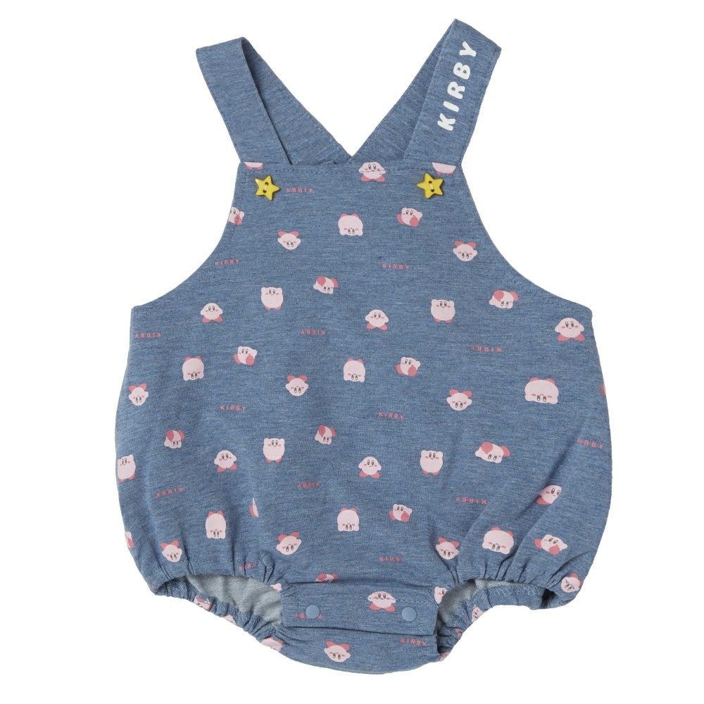 カービィフェイスが大胆にプリントされた、サロペット風デザインの半袖ロンパース。