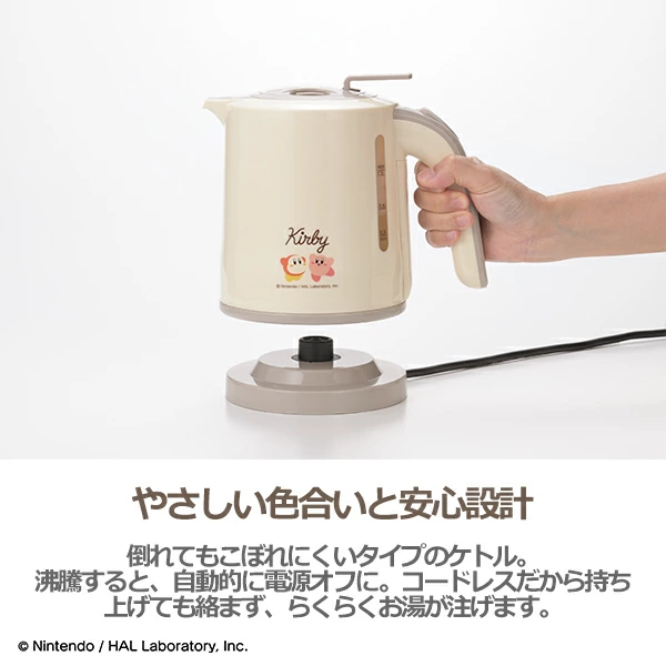 「電気ケトル1.0L」は大容量&コードレス仕様で、倒れてもこぼれにくく安心設計ドリンクタイムをカービィカラーに演出します。